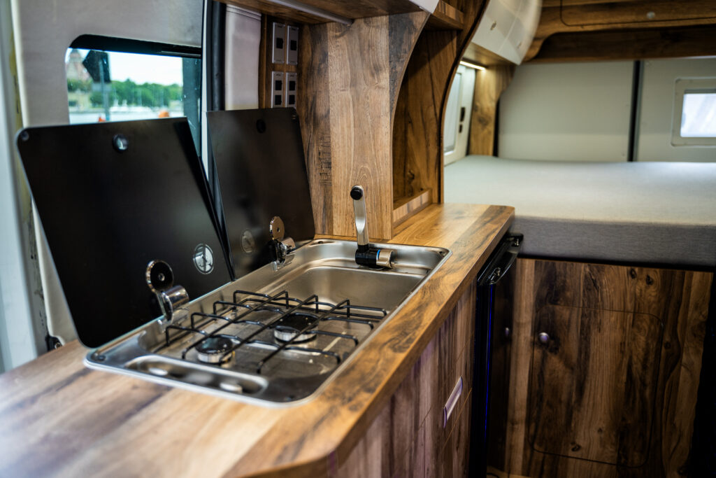 „W kamperze każdy centymetr ma znaczenie. Zależało mi, by była swobodna komunikacja w części dziennej, dlatego musiałem maksymalnie zoptymalizować grubość płyt w kuchni i salonie. Blaty wykonałem w technologii sandwich — z lekkim rdzeniem piankowym i wykończeniem HPL w kolorze ciemnego dębu. Fronty powstały z forniru bielonego modrzewia, zabezpieczonego lakierem UV. Dzięki temu całość jest lekka, a przy tym odporna na intensywne użytkowanie.”